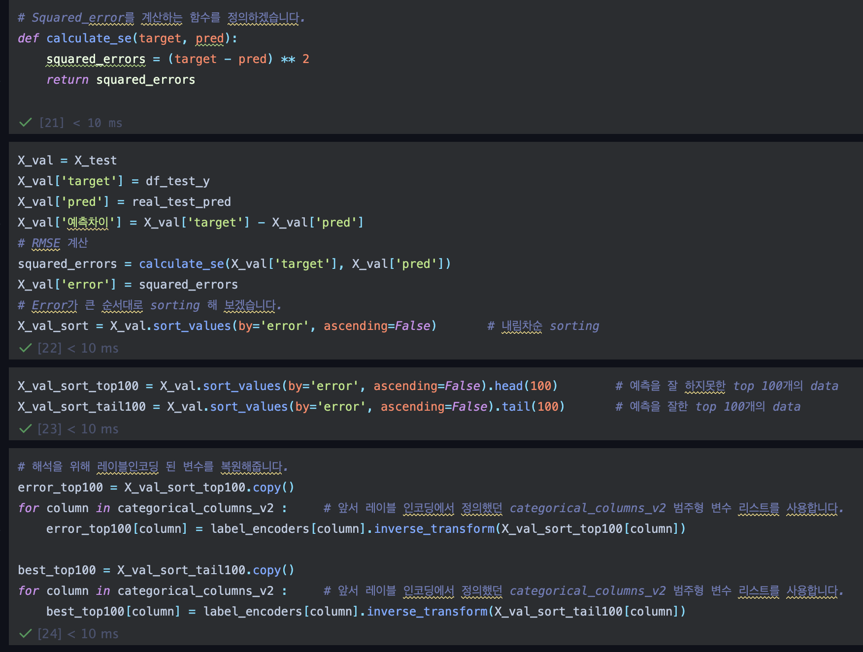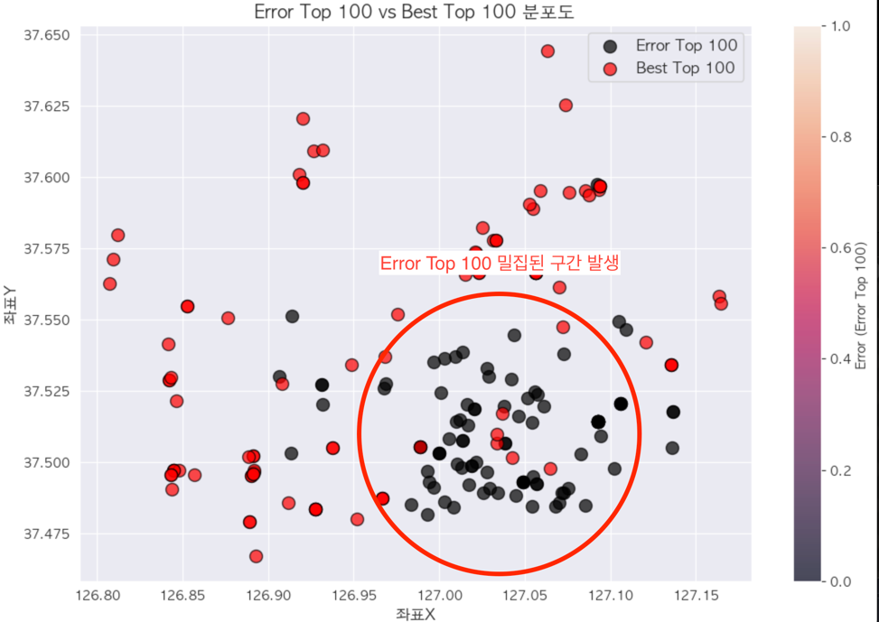 - 특이한점은 Error Top 100 개의 데이터들이 한지점에 밀집되어있다는 것을 확인할 수 있었습니다.