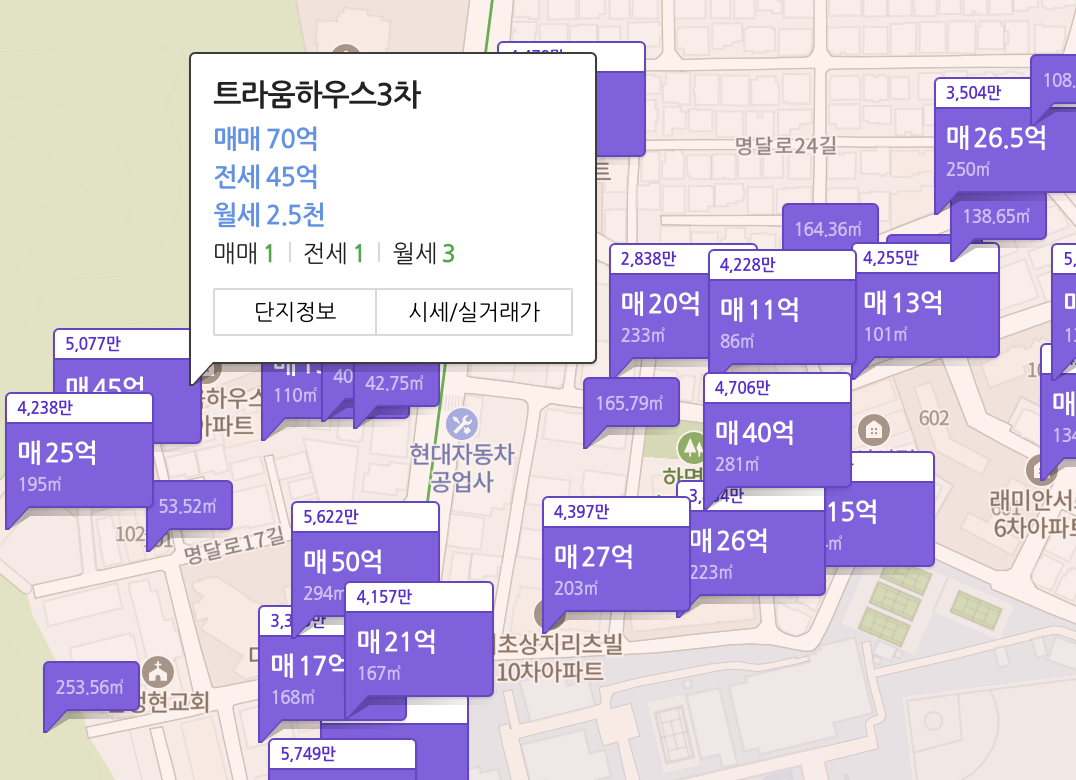 좌표 지점별분석으로 지역별로 아파트 가격이 다르다는것을 알 수 있다.