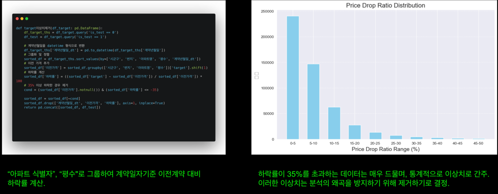 전용면적 이상치를 제거한 모델이 예상과 달리 성능이 저하되는 결과를 보여, 데이터의 다양한 특성을 포괄하는 접근이 중요함을 깨달았습니다.