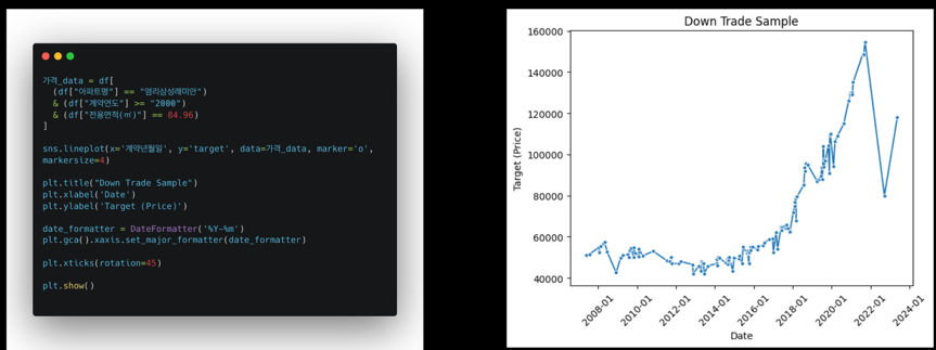 아파트AND거래년-월-주차그룹화하여 로 target을 평균계산- 가설: 일자별로 흩어져있는 거래데이터가 주차별로 묶으므로써, 균형잡힌 데이터로 되어 모델의 성능이 향상될 것으로 예상