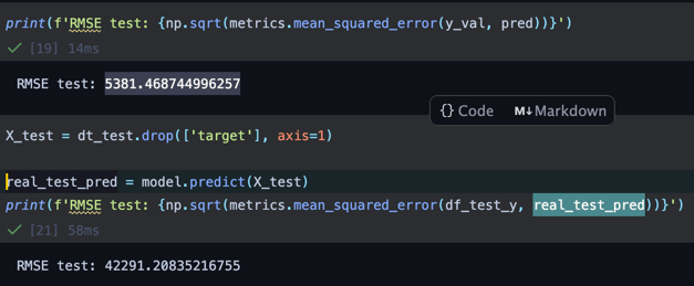 최종 `RMSE`는 `45000 => 22,055`로, 초기 베이스라인 대비 큰 성능 향상을 이루었습니다.