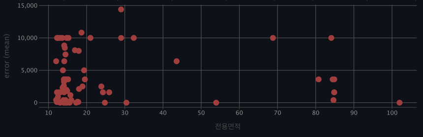 - 가설: 전용면적 이상치 제거 시, 비싼 가격의 아파트 데이터가 제거되어 오차가 증가할 것으로 예상.
