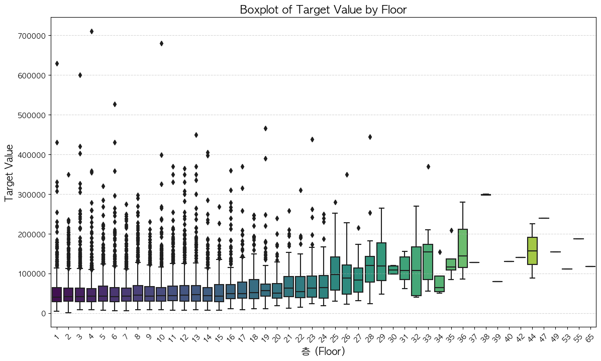 - 낮은 층수일수록 상대적으로 낮은 중앙값을 가지지만,
