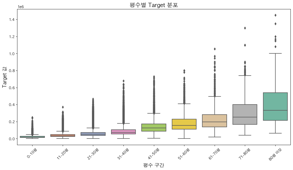 - 평수가 증가하면 가격이 상승하는 경향성을 보인다.